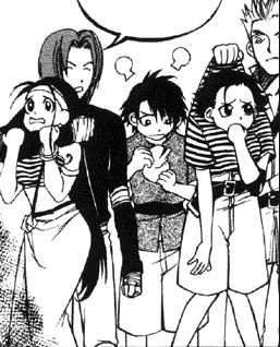 A year before the series begins, Triple Threat were on the hunt for a criminal named Dreymon. While his strength was nothing special, he was very good at keeping hidden. At the time, newbie players Julie and K.C. attempted to steal from them, but were caught. Boromir and Roto threaten to take them to jail, since stealing is a crime in the game, just like the real world. Ah-Dol, however, recognizes them as the pop idols, The Lovely Angels. The girls admit this, acting cute and hoping an autograph will get the to let them go. Immediately sensing a golden opportunity, Roto is interested in the fact they are The Lovely Angels and Boromir adds they have no use for an autograph. The group evilly blesses their fortune as the girls hold each other in fear of them. The team opens a stand outside of town to exploit them. Boromir advertises as loudly as he can that players can have the chance to kiss for 100 Gold, hug for 150 Gold or both for 230 Gold. Ah-Dol is apprehensive, but goes along with it as Roto collects the fees and has players sign a non-disclosure contract. Overenthusiastic (and even gross) fans line up to kiss and hug them, despite K.C. and Julie's objections.